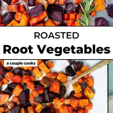 *Double for a crowd and use 2 baking sheets: the baking time may be slightly longer because there’s more surface area in the oven. You can use any type of root vegetables in this recipe, including onions, parsnips, turnips, or fennel.