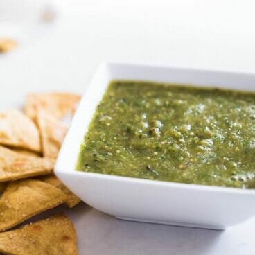 This roasted tomatillo salsa, also called salsa verde, is a tangy salsa with a spicy kick! This one’s from the master of Mexican food himself, chef Rick Bayless.