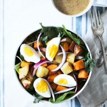 A few recipes in our archive are old favorites, some we make often and some have faded into memory. I came across this one the other day and knew we had to remake it. This healthy potato salad is a different type of potato salad: potatoes served over greens instead of with mayo. It can be either a main or a side salad featuring roasted red potatoes, sweet potatoes, hard-boiled eggs and greens with our very favorite honey mustard vinaigrette. Keep reading for the healthy potato salad recipe!