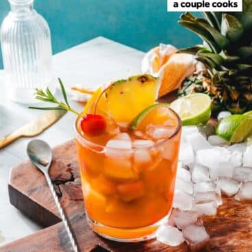 - For the garnish: cocktail cherry, pineapple wedge, lime wedge