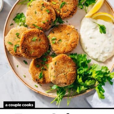 Are you a salmon lover? Here’s one for you: this salmon croquettes recipe! Similar to salmon cakes or salmon patties, they’re simple and incredibly tasty. Mix canned salmon with some spices and breadcrumbs, then pan fry them until golden. Serve dipped into tartar sauce or remoulade, and they’re a total treat! You can serve them as an appetizer or as a meal with some simple sides. Our 6 year old absolutely gobbles these down!