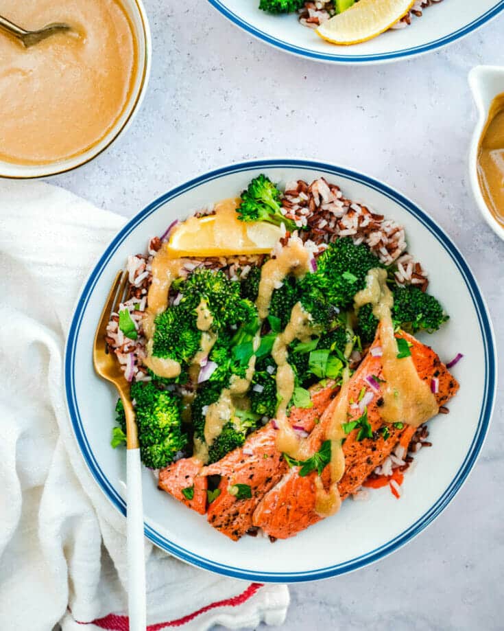 So here’s a fun salmon dinner idea: the Simple Salmon Bowl! The tender, seasoned fish is offset with rice, crisp tender broccoli, and covered in an easy, creamy flavor popping sauce. Serve with Tahini Dressing or Miso Dressing.