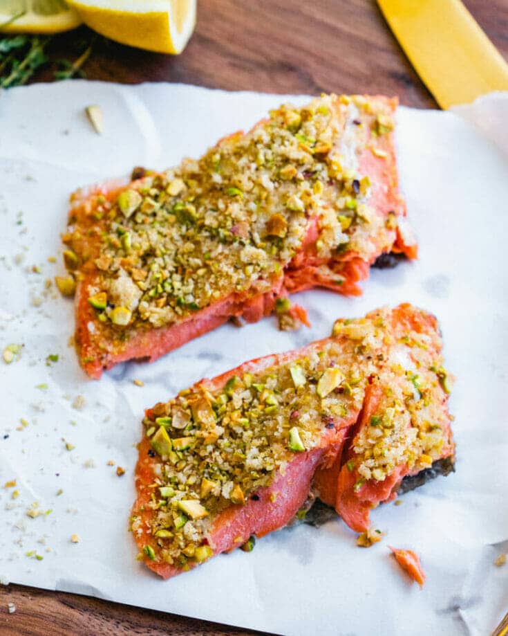 Looking for an easy salmon recipe to impress everyone? Try this Pistachio Crusted Salmon! The aroma wafting from the oven will have you salivating before the food even reaches your plate! Each bite of tender fish and the crunchy, Parmesan pistachio topping makes you immediately want to take another.