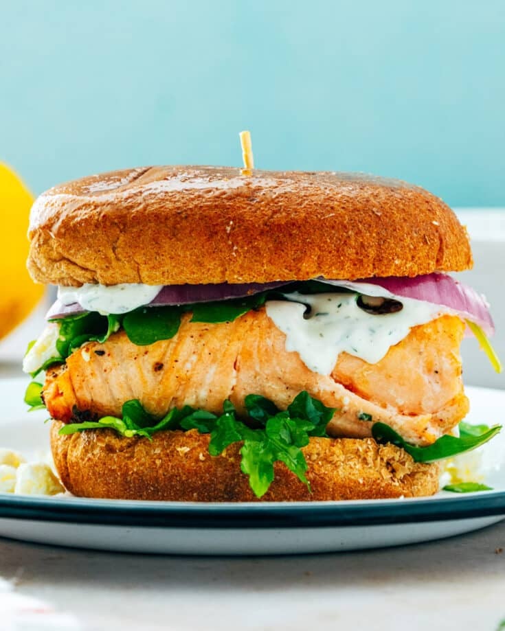Want a fun salmon dinner idea? There’s something so satisfying about a good fish sandwich, and this one is irresistibly tasty. Throw a fillet of Old-Bay seasoned pan seared salmon onto a bun, then top with feta crumbles, red onion and creamy, lemony dill sauce.
