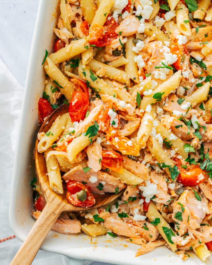 Looking for easy salmon recipes? Here’s one to add to your regular rotation: try this baked Salmon Pasta recipe! This recipe is bursting with flavor, from tender flakes of salmon, zingy lemon and capers, and mix of Mediterranean-style vegetables.