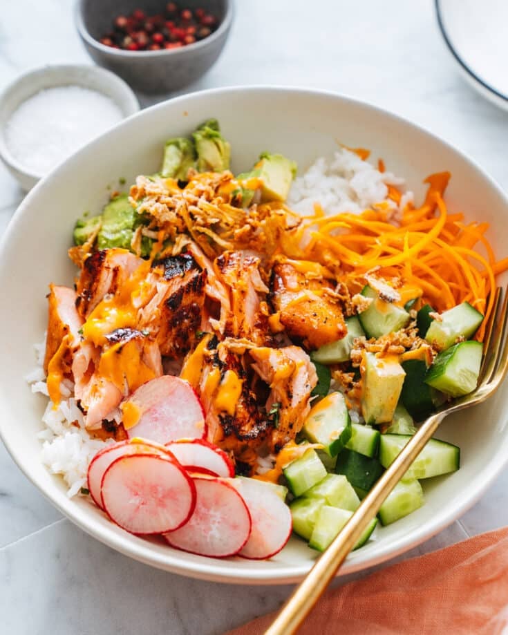 This tasty bowl of salmon and rice has a few flavor secrets. The chunks of tender fish are covered in an irresistible savory, garlicky and a little sweet salmon marinade. Combine that with fluffy rice and fresh veggies, then cover it with a spicy mayo to really make it pop.