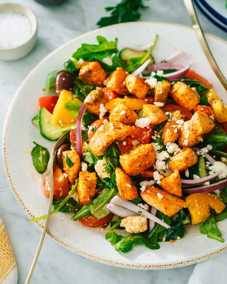 This Greek salmon salad is a healthy and satisfying dinner full of bold Mediterranean flavors! The star of the show is salmon bites, bite-sized pieces that add a pop of protein to each bite. Layer them over juicy tomatoes, cool cucumber, and feta cheese.