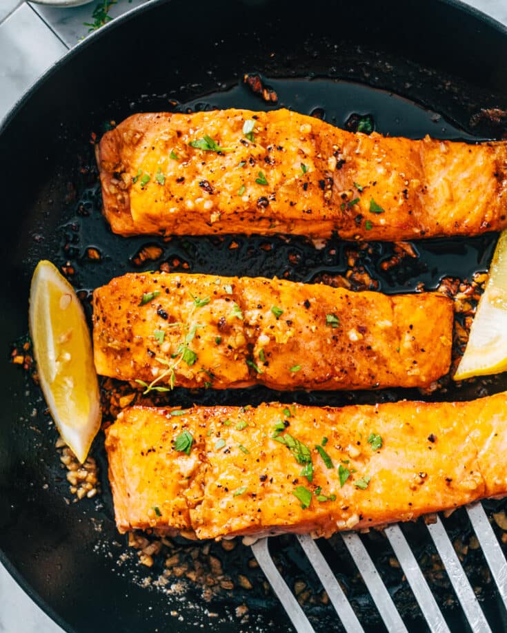 Here the salmon is pan fried for brown, seared exterior, then baked in the oven until it’s perfectly tender. Drench it all in this sticky honey garlic sauce, a sweet savory glaze that adds layers of complexity in flavor. It’s one of our top salmon dinner ideas!