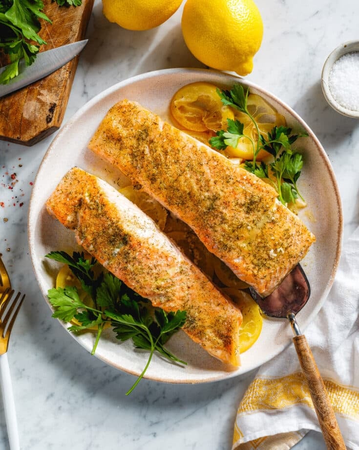 The salmon in this recipe is roasted right on top of actual lemon slices and butter, which bakes into a sauce that you can spoon over the tender fish. Seasoned with a little dill and garlic powder, you can broil the top to get it lightly crisp after baking.