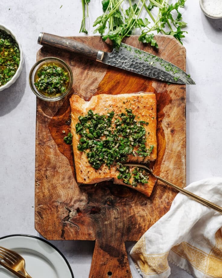This chimichurri salmon pairs moist flaky salmon with the tangy, garlicky punch of this herby sauce—these flavors were made for each other! It’s so quick and easy to make broiled, or you can try it baked or grilled.