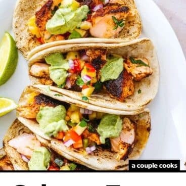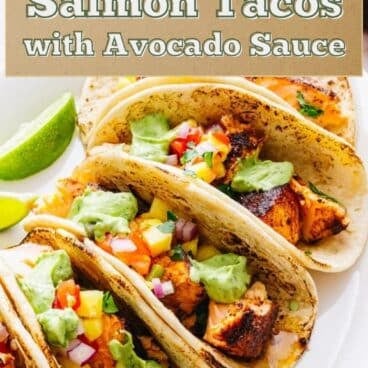 If there’s one dinner that always goes over well in this house, it’s tacos. And here’s a new favorite: salmon tacos with creamy avocado sauce! They’re bursting with fresh, zingy flavor, pairing blackened salmon with pineapple pico and a bright green creamy sauce. This easy healthy dinner tastes restaurant-style, but you can whip it up in about 30 minutes. A dinnertime win! It pleases everyone in our house.