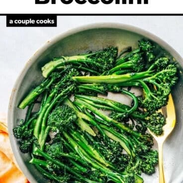When it comes to quick and impressive side dishes, this one might be tops: sauteed broccolini! The elegantly long stems of this green veggie make it look fancy, but here’s a secret. You can cook it up in just 5 minutes in a hot skillet, making it one of Alex and my favorite sides for an impressive meal.