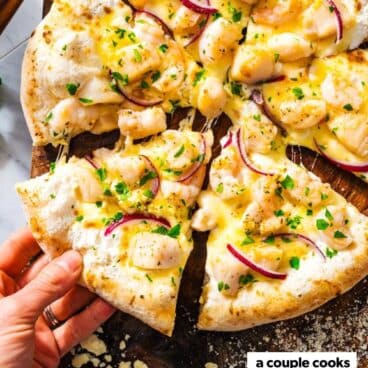 Calling all seafood lovers! This pie is just for you! This delectable seafood pizza is full of bold flavors, featuring shrimp and scallops sauteed with garlic until they’re succulent and tender. They’re sprinkled onto a layer of seasoned ricotta cheese, then topped with gooey mozzarella, red onion and herbs. Right before serving, drizzle with a warm garlic butter and it’s a little bit of heaven!