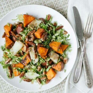 A perfect balance of textures and flavors this sweet potato salad features shaved Brussels sprouts, roasted sweet potatoes, pecans, and Gouda cheese.