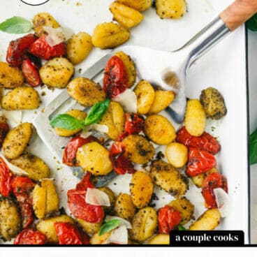 This sheet pan gnocchi recipe is so easy: there’s no boiling required! Bake it up with tomatoes and pesto and prepare to be amazed.