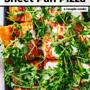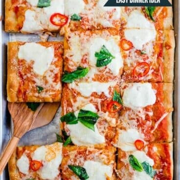 What’s the easiest way to make pizza? Sheet pan pizza! This style of pizza is what I use when I want to serve a crowd—it makes a big pan that’s the equivalent of three medium pizzas. The best part is you don’t need any special equipment like pizza stones or peels, and you don’t even have to shape the dough. And it’s even quicker than my pan pizza or focaccia pizza recipe!