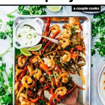 The shrimp comes out juicy and succulent, and everything is infused with an irresistible combination of spices. Wrap it up in a soft tortilla with lime crema, and it’s a total crowd pleaser. This one is always a big hit with everyone in the family: even our kids! Serve with tortillas or as fajita salad.