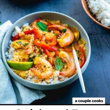 This easy shrimp curry tastes better than a restaurant in under 30 minutes! It’s a Thai red curry flavored with coconut milk and curry paste.