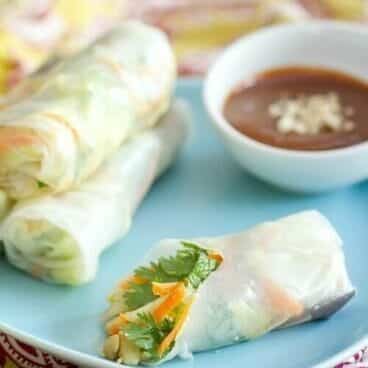 These fresh rolls are a delicious burst of fresh flavors. Instead of frying to achieve a crunchy exterior, the rice paper wrapper in this easy spring roll recipe is kept fresh. Spring rolls and summer rolls can be stuffed with many different fillings. This fresh rolls recipe takes minimalist approach by using only herbs, chopped peanuts, and iceberg lettuce to provide a crunchy texture. We found the simplicity to be perfectly satisfying; though of course you can customize the filling to your own liking.