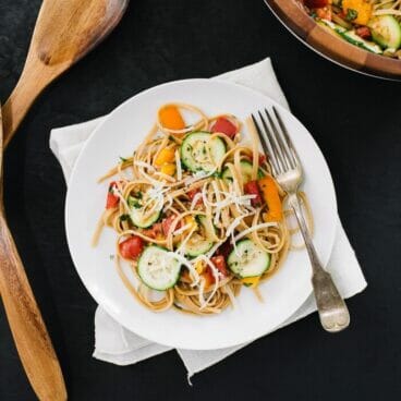 This pasta with zucchini is everything summer: mix noodles with ripe tomatoes, zucchini, herbs, and Parmesan cheese and you’ve got dinner in a flash.