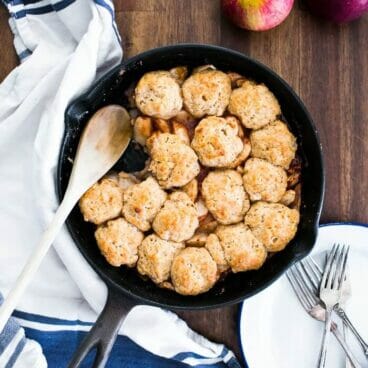 Here’s a fun dessert idea that you can whip up right in your cast iron skillet. Skillet apple cobbler! How could your day not be just a teeny bit brighter with a skillet apple cobbler? The cozy spiced apples are topped with tender biscuits, all nestled in a skillet and baked until golden brown. Serve with a bit of melty ice cream and it’s totally irresistible.