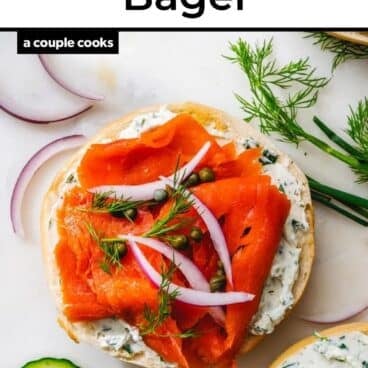 - Optional toppings: Thinly sliced English cucumber and tomato are also traditional on a smoked salmon bagel, but to us they’re not essential.