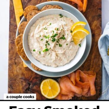 Need a fun party dip? Let us introduce you to this Smoked Salmon Dip recipe! This creamy dip has a bit of a retro vibe, which makes it all the more endearing (we think). Our recipe uses a bit of Greek yogurt for a healthier spin. But it’s still chock full of rich flavor: hearty cream cheese, punchy Dijon, and that intensely smoky flavor that only fresh smoked salmon brings. Mix it up in 5 minutes, and it’s good for days in the fridge. It also works as a smoked salmon spread: it’s a perfect party snack!