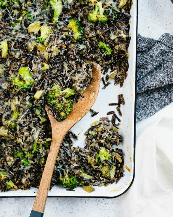Here’s a recipe where sour cream makes a quick and easy casserole sauce! This modern spin on wild rice casserole that’s cozy and all about whole foods! It’s broccoli cheese flavor, flecked with savory bits of broccoli, gooey white cheddar, and a creamy easy-to-make filling. While it’s got a vaguely 1970’s vibe, this one is all whole foods and heavy on the plants. (No cream of mushroom soup!)