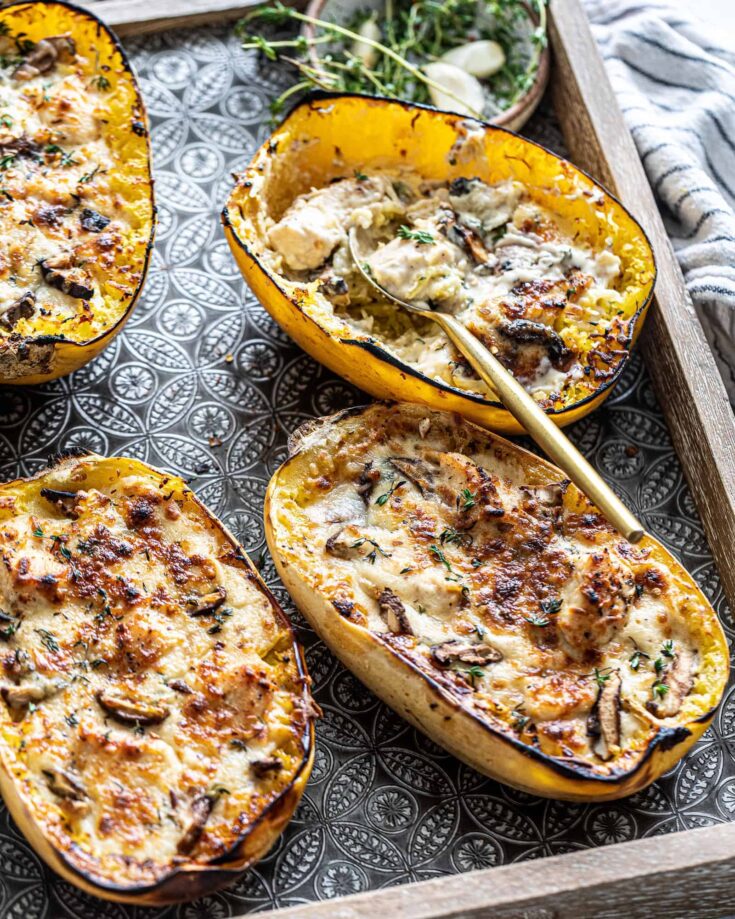Here's a fun way to mix up your spaghetti squash routine: with chicken alfredo! Swap out the pasta in this savory, cheesy blend of juicy chicken, creamy alfredo, and roasted squash. It's perfect for those chilly fall evenings!