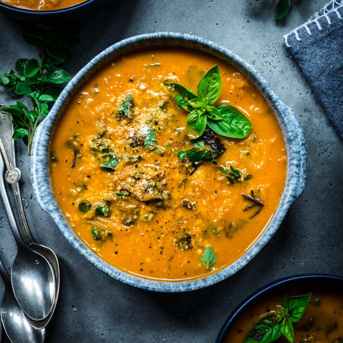 Ever tried spaghetti squash...as soup? This creamy, flavorful soup features naturally gluten free noodles with chard, carrots, and celery in an herby tomato-based broth. A cozy soup for the fall and winter! via Crowded Kitchen