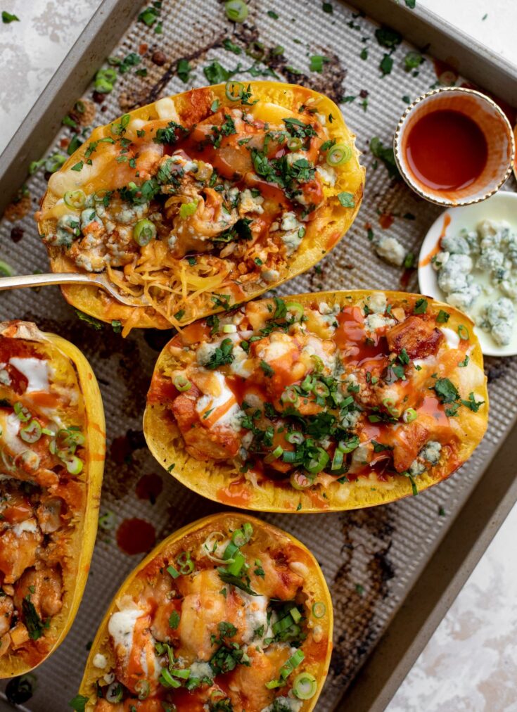 We're ending with our favorite of these spaghetti squash recipes: buffalo chicken stuffed squash! Tender chicken, buffalo sauce, sharp cheddar, and blue cheese all in a spaghetti squash? Yes please! via How Sweet Eats