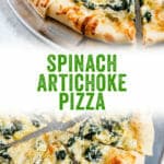 We have a few pizza dough recipes that you can make depending on your tastes and equipment. Our Best Pizza Dough is what we used for this spinach artichoke pizza. We make it using stand mixer, but you can also knead it by hand.