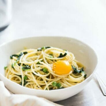 To mimic the smoky taste of bacon, this vegetarian carbonara recipe uses smoked mozzarella instead! It’s also mixed with spring vegetables: green peas and a bit of sauteed spinach, to add some extra nutrients and texture. The combination of the cheeses plus the creamy, complex flavor of the egg yolk stirred in as an instant sauce makes the pasta taste both springy and light and supremely satisfying.