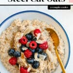Are you a steel cut oats fan? These chewy oats have a porridge-like texture and feel like a cozy hug in the morning. They’re a fun way to mix up the standard Old Fashioned oats, and may have some slight benefits over them: though both are an incredibly healthy way to start the day! Alex and I used to avoid this type of oats because they take longer to cook. But here’s the thing: you can make a big pot of steel cut oats in 25 minutes and eat off of the leftovers all week! They come out beautifully creamy and a fitting canvas for tasty toppings.