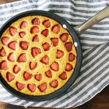 I absolutely loved this – it’s wonderfully moist and crumbly at the same time. I didn’t have fresh strawberries on hand, so I whipped up a compote with some frozen ones and served the warm, jammy strawberries over the freshly baked cake. Your suggestion for heating it up worked wonders; I had a slice for breakfast the next morning and it was just sweet enough without being indulgent. Thanks for such a lovely recipe!
