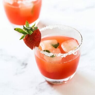 This strawberry margarita with mint lime ice is a little toast to spring, using seasonal produce that is starting to pop here in Indiana. Sweet strawberries go hand in hand with tart rhubarb, and this classic flavor combination is not just for cobbler and crisp. (Try our strawberry rhubarb crisp or rhubarb crisp, by the way.) It’s perfect in a drink like a margarita to bring just the right sweet tart flavor.