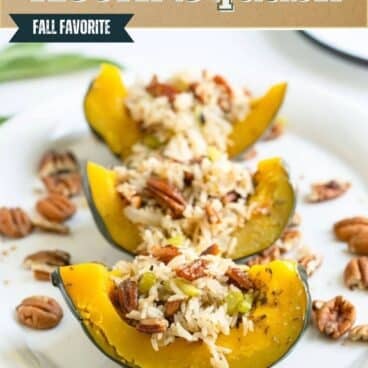 Ready for the best stuffed acorn squash recipe? Alex and I have made many acorn squash recipes in our day. And this one is our absolute favorite. The creamy squash is roasted until tender, then it’s draped in a toasted pecan rice stuffing that makes your kitchen smell like a fall paradise! You know that scent of onions and celery cooking in butter? Well, this recipe delivers it in spades. It’s vegetarian, easily made vegan, and naturally gluten-free, so it works for all sorts of eaters. Even better: it’s seriously crowd pleasing. Everyone we’ve served it to becomes a believer…and then immediately asks for the recipe.
