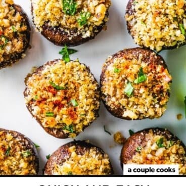 We engineered this stuffed mushrooms recipe to be simpler than most. That means no sautéing filling ingredients: just chop them up and fill the mushrooms! Here are a few things to note about the method (or jump to the recipe below):