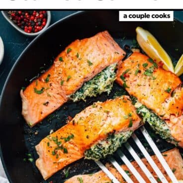 This stuffed salmon recipe comes together easily, but it does require a bit of technique for the pan frying. One of our top tips: invest in a food thermometer, which will help you cook the salmon to the perfect doneness. Here are a few particulars: