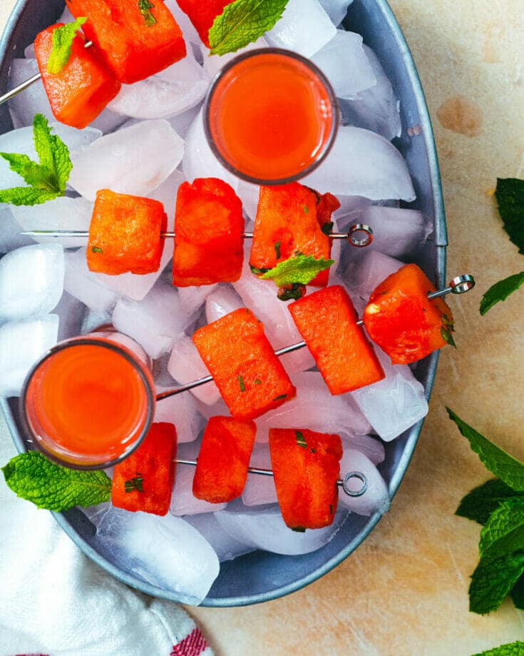 Here's an inventive summery appetizer: Watermelon Tequila Skewers! Yes, you’ll most often see watermelon and tequila paired in a cocktail (and who could turn down a watermelon margarita?). But sprinkle some over watermelon cubes and it’s absolute genius! Don't want the alcohol? Skip it to make Watermelon Lime Skewers: they're just as good.