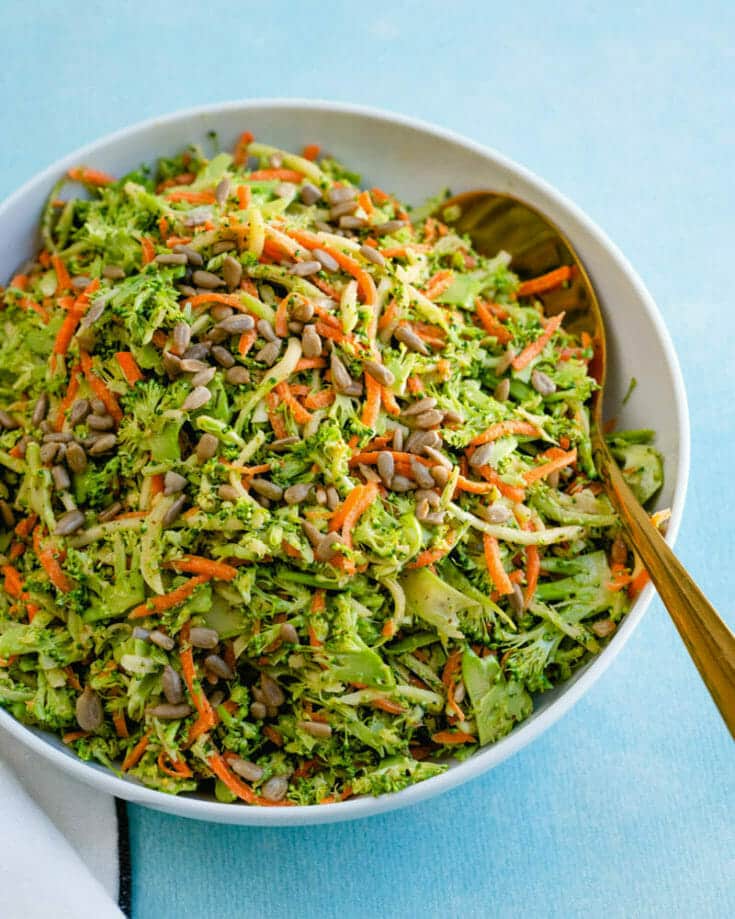 Here’s a fresh spin on the classic broccoli slaw! And who knew it could be so irresistibly tasty? This recipe you can make with store-bought broccoli slaw bags or fresh broccoli and carrots. It’s got a creamy dressing that’s equal parts savory, tangy, and a little sweet. Try this stunner of a broccoli recipe…you won’t be disappointed.
