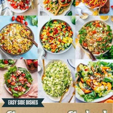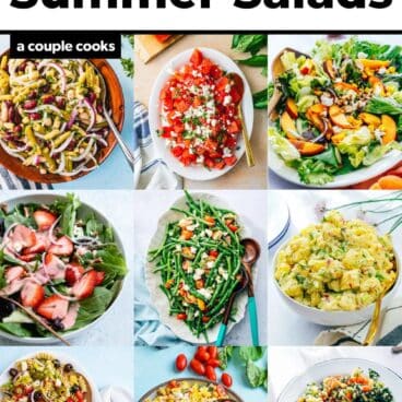 Here are a few of my favorite summer salads including salads of all types: green salads, vegetable salads, fruit salads, grain salads and pasta salads. They star ingredients of the season like juicy tomatoes and peaches, ripe strawberries, and sweet melon and corn. They’re perfect for pairing with burgers, a grilled dinner, or to round out a pitch in table. Ready to get started?