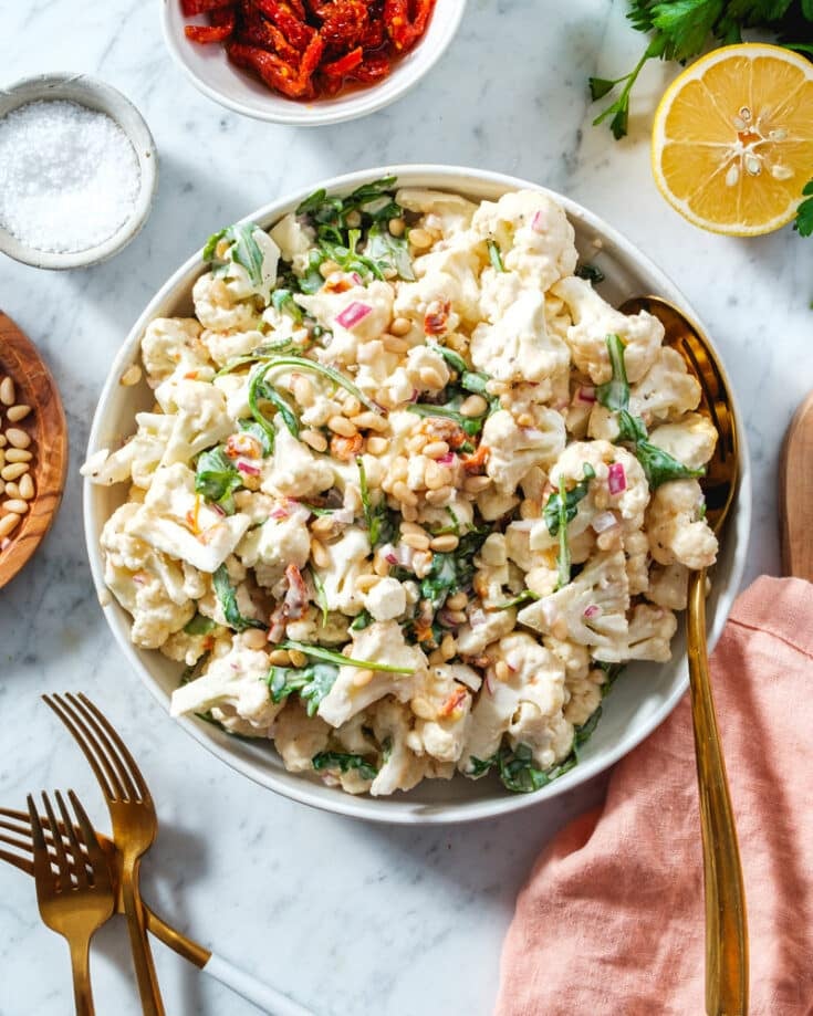Here’s a fun summer salad to infuse any meal with flavor: cauliflower salad! This one is so much fun, sort of like a mashup of Mediterranean-style flavors with a retro barbecue salad. The raw florets are covered in a tangy, creamy dressing and mixed with peppery arugula, tangy sun-dried tomatoes, and toasted pine nuts! Delish.
