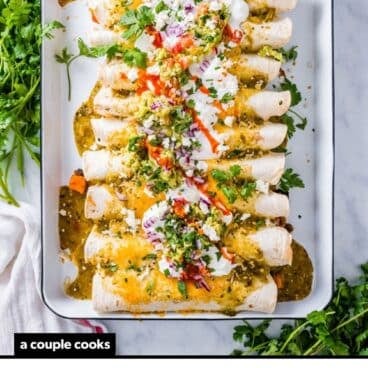 *Depending on your baking dish, you may need 2 dishes to fit all 10 tortillas. This recipe technically makes enough for 12 tortillas, if you can fit them all in a baking dish or baking sheet.