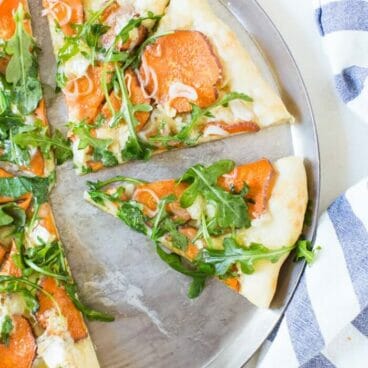 A simple sweet & savory combination, this sweet potato pizza combines roasted sweet potatoes, creamy brie cheese, and peppery fresh arugula.