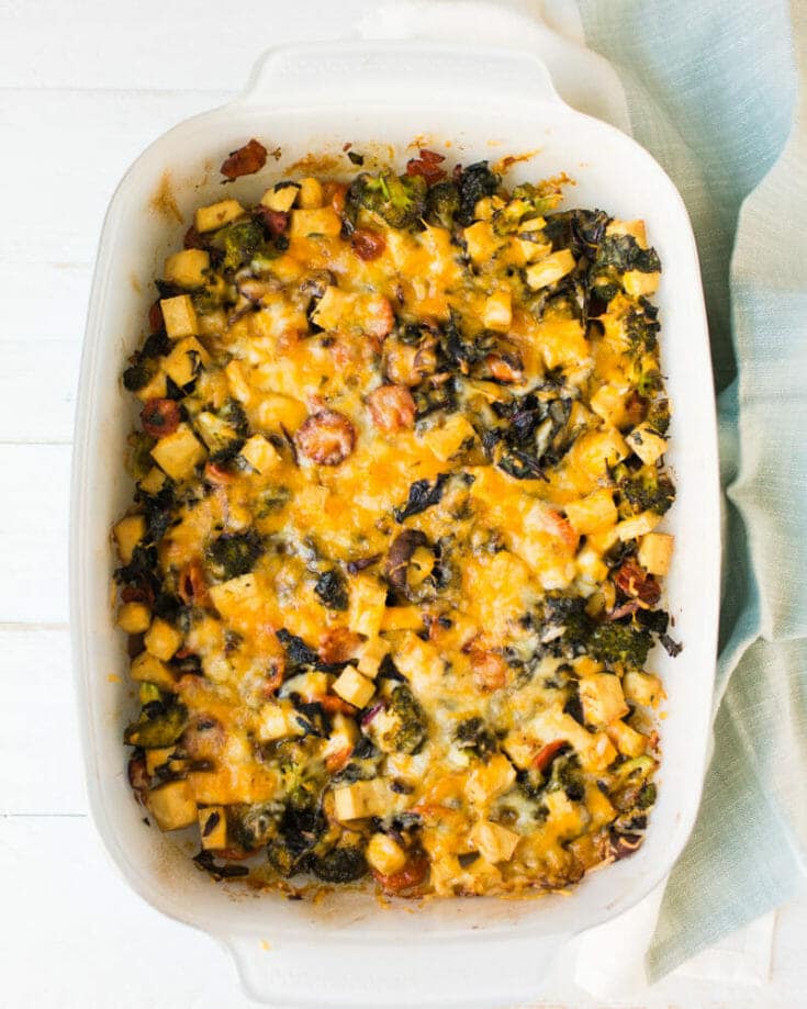 Another great way to use chard in a recipe is to hide it in a cozy bake or casserole! This harvest vegetable bake is savory and refined: it tastes almost meaty! It's perfect for Meatless Mondays or a even a cozy brunch. It’s a combination of vegetables and baked tofu, topped with cheese and baked until bubbly.