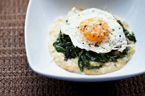 Here's a cozy, savory chard recipe: creamy polenta with chard! This Italian-style recipe also has vibes of the American south, similar to grits with sauteed Collard greens. The chard is sauteed with garlic and perfectly salted, then served over creamy, savory polenta. Top it with a fried egg to make it a complete meal.