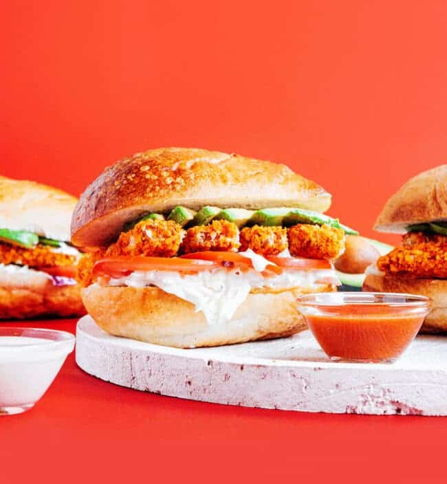 This tempeh recipe is a great way to make a plant-based substitute for buffalo chicken! Spicy hot buffalo sauce, creamy avocado, and a tangy ranch slaw makes these buffalo tempeh sandwiches fiery perfection. via Live Eat Learn