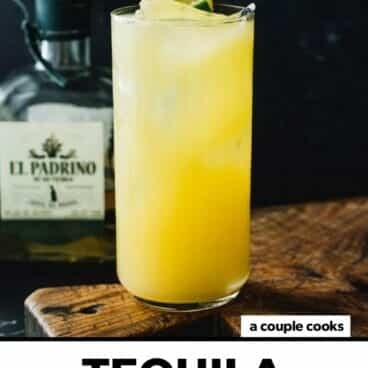 Want to go even fancier? Make it into a Tequila Sunrise! All you’ll need is ¾ ounce grenadine, a popular pomegranate flavored cocktail syrup. If you’re into cocktails you’ll likely have this on hand, and it’s also easy to make at home. Try our DIY Grenadine Syrup! Here’s the basic idea (or jump to the recipe below):
