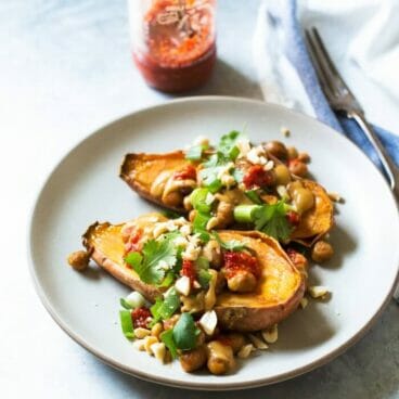 Smothered in a zesty ginger tahini sauce, this Thai-style vegan sweet potato recipe is a simple vegan dinner that’s full of flavor.